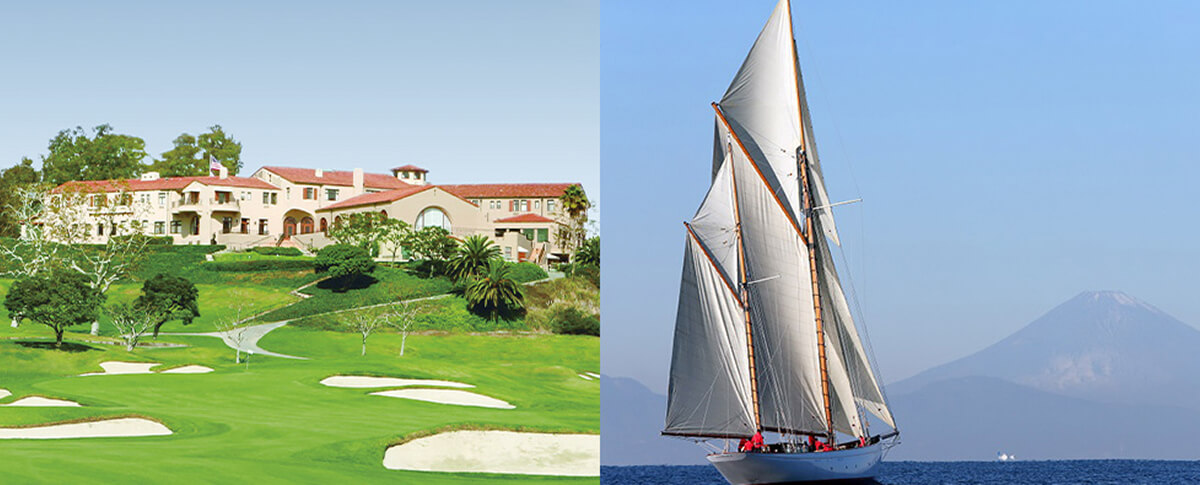 米国ロサンゼルス、世界屈指の名門「リビエラカントリークラブ」と1927年英国建造の大型木造帆船「シナーラ」。