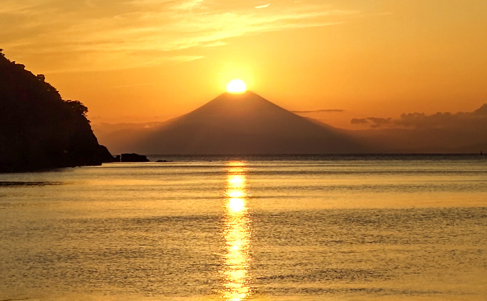 富士山頂に太陽が重なり、ダイヤモンドのように美しく煌めく自然現象です。気象条件などいくつもの条件が重なった時にしか現れない希少な瞬間で、リビエラ逗子マリーナでは、半年に1度チャンスが訪れるといわれています。