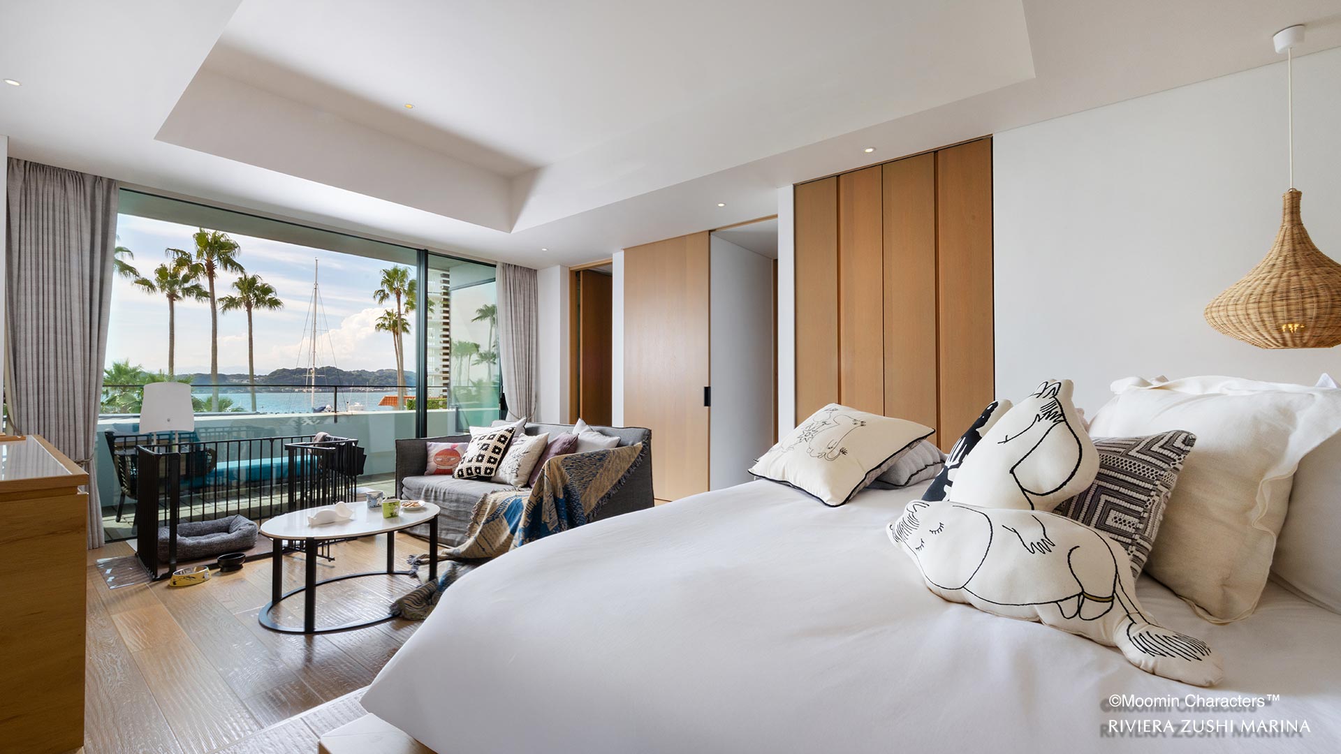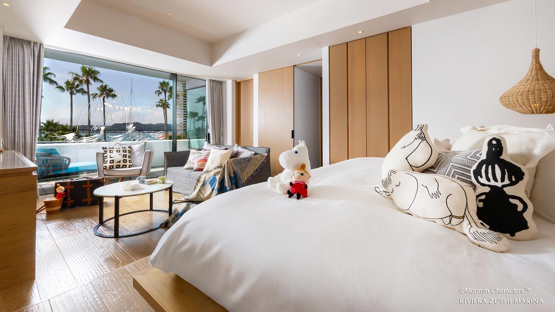 約900本のヤシの木、海越しの富士山や江の島を望むロケーションの中で、「ムーミン」たちと一緒に非日常のひとときをお過ごしください。ここでしか手に入らないリビエラ逗子マリーナ限定のムーミングッズも付いてきます。