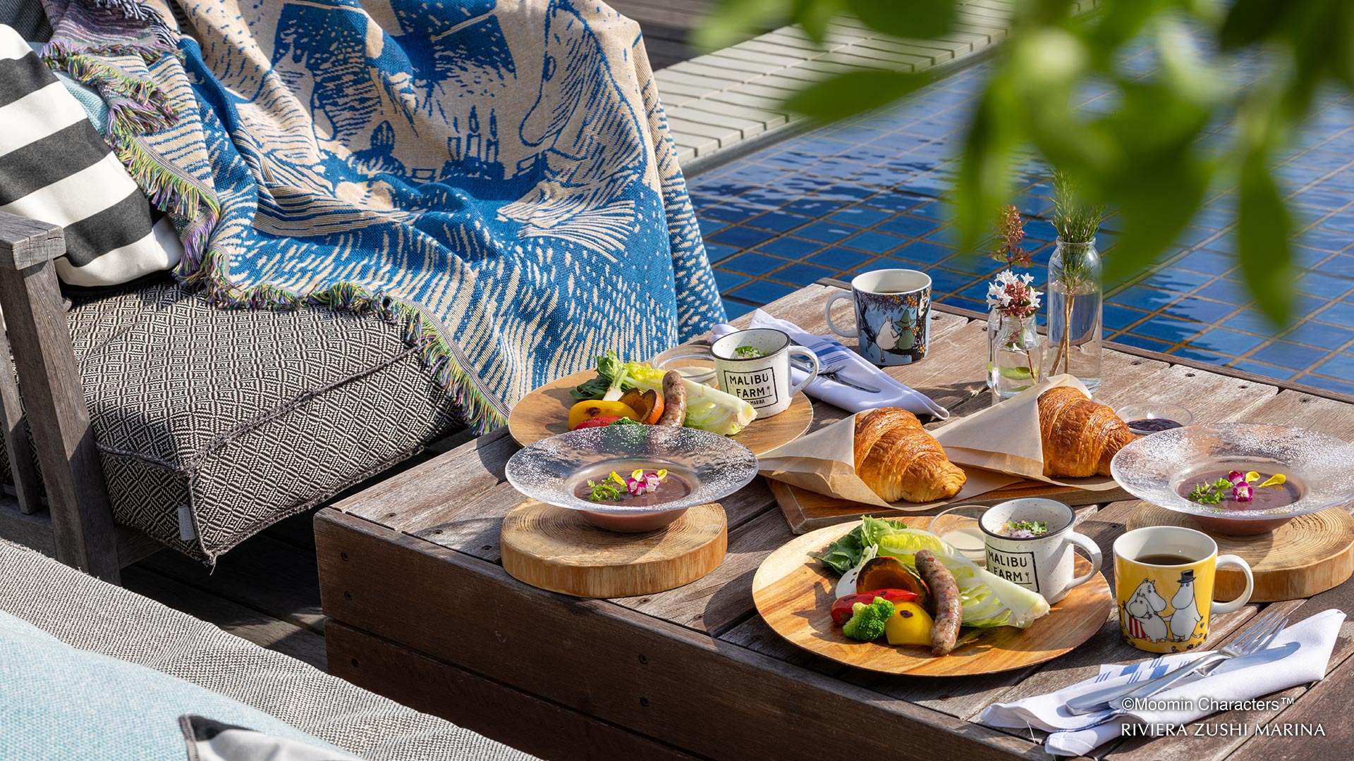 ムーミンのコミックス『南の海で楽しいバカンス』に登場するリゾート地“リビエラ”で過ごすムーミンたちの世界観を大切にし、「“ムーミン”と過ごす海辺の時間」をコンセプトに設えました。