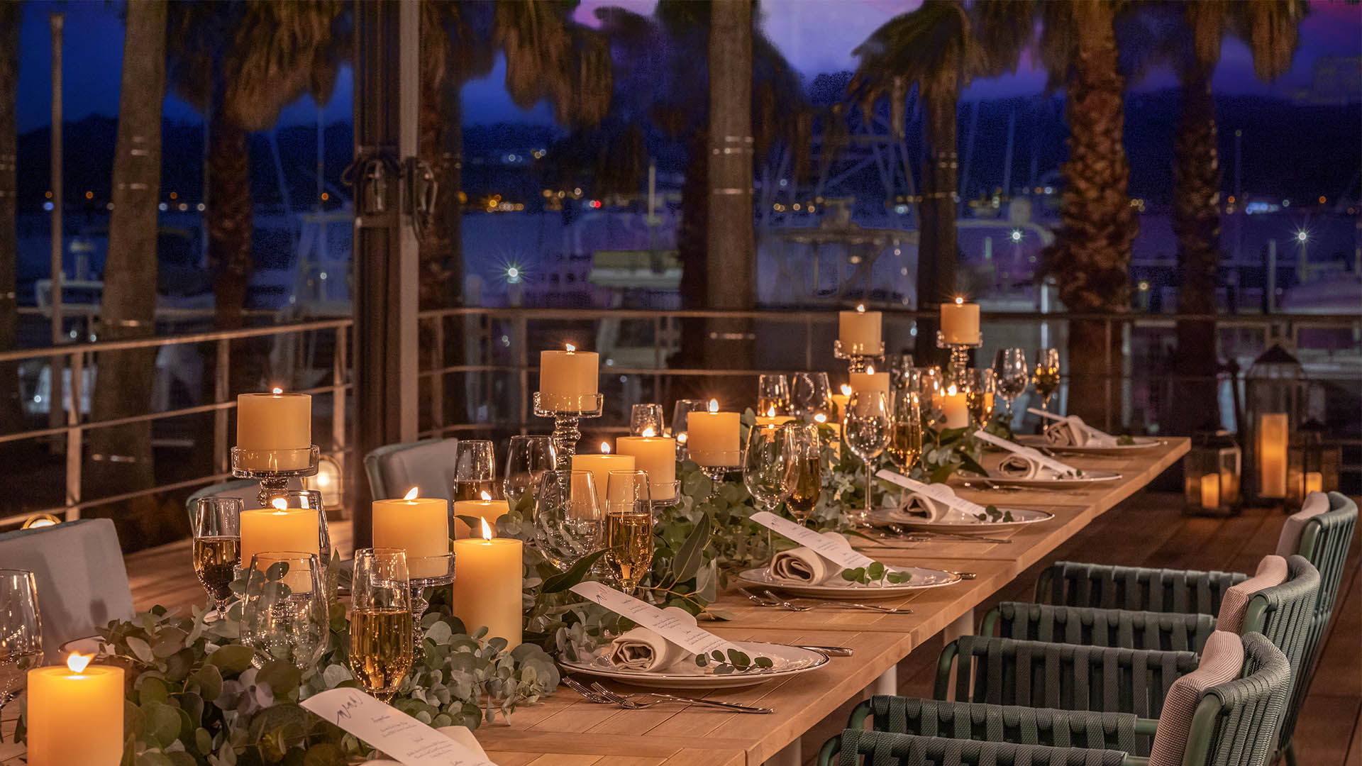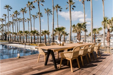 全開可能な一面窓の店内はテラス席と一体となる設えで、どの席からもヤシ並木を眺められ開放感を味わえます。マリーナの海からつながるような大きな水盤が広がるテラスには、三方を水に囲まれたウォーターテラス席や暖炉を囲むファイヤーテラス席など、シチュエーションに応じてお使いいただけます。