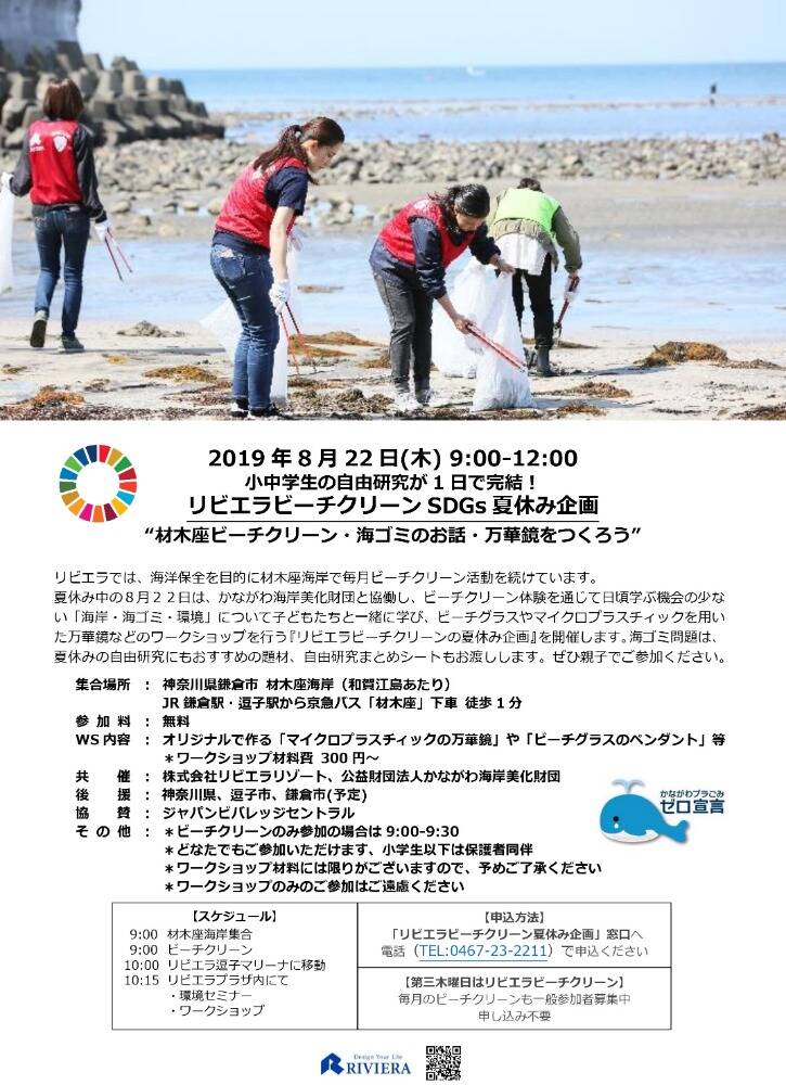 リビエラでは、海洋保全を目的に材木座海岸で毎月ビーチクリーン活動を行っております。夏休み中の8月22日は、かながわ海岸美化財団と協働し、ビーチクリーンを通して「海岸・海ゴミ・環境」について子供たちと一緒に学び、ビーチグラスやマイクロプラスチックも用いたワークショップを行う『リビエラビーチクリーンの夏休み企画』を開催いたします。