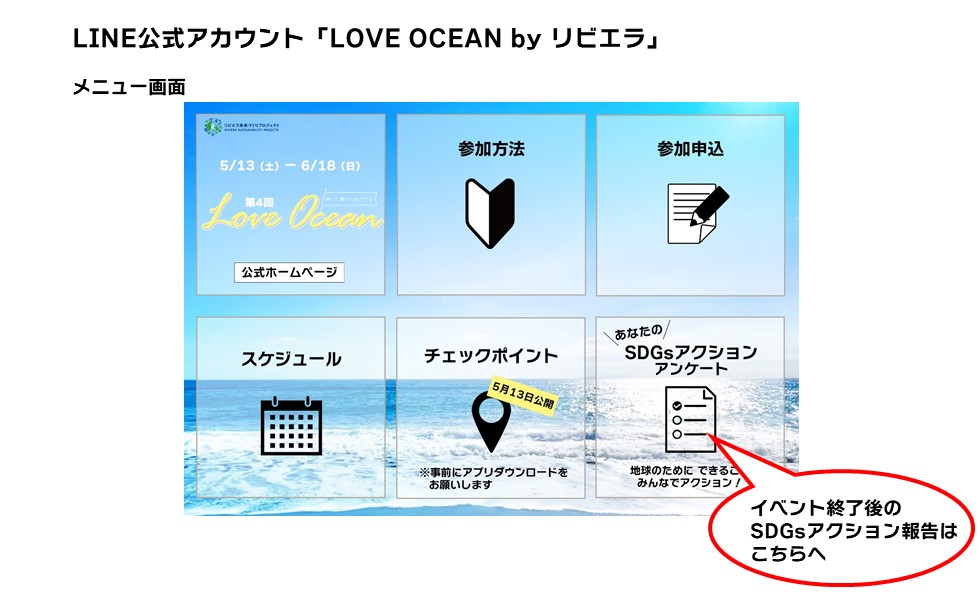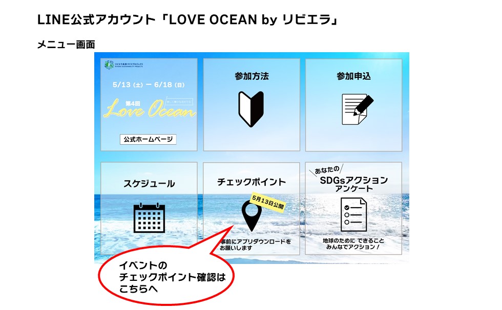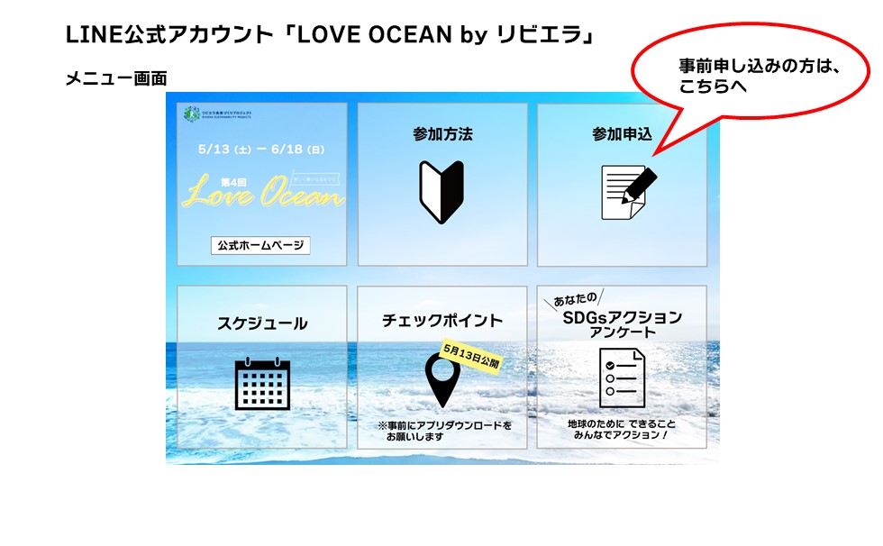 まず最初に、LINE公式アカウント「LOVE OCEAN by リビエラ」の友だち登録を必ずお願いします。